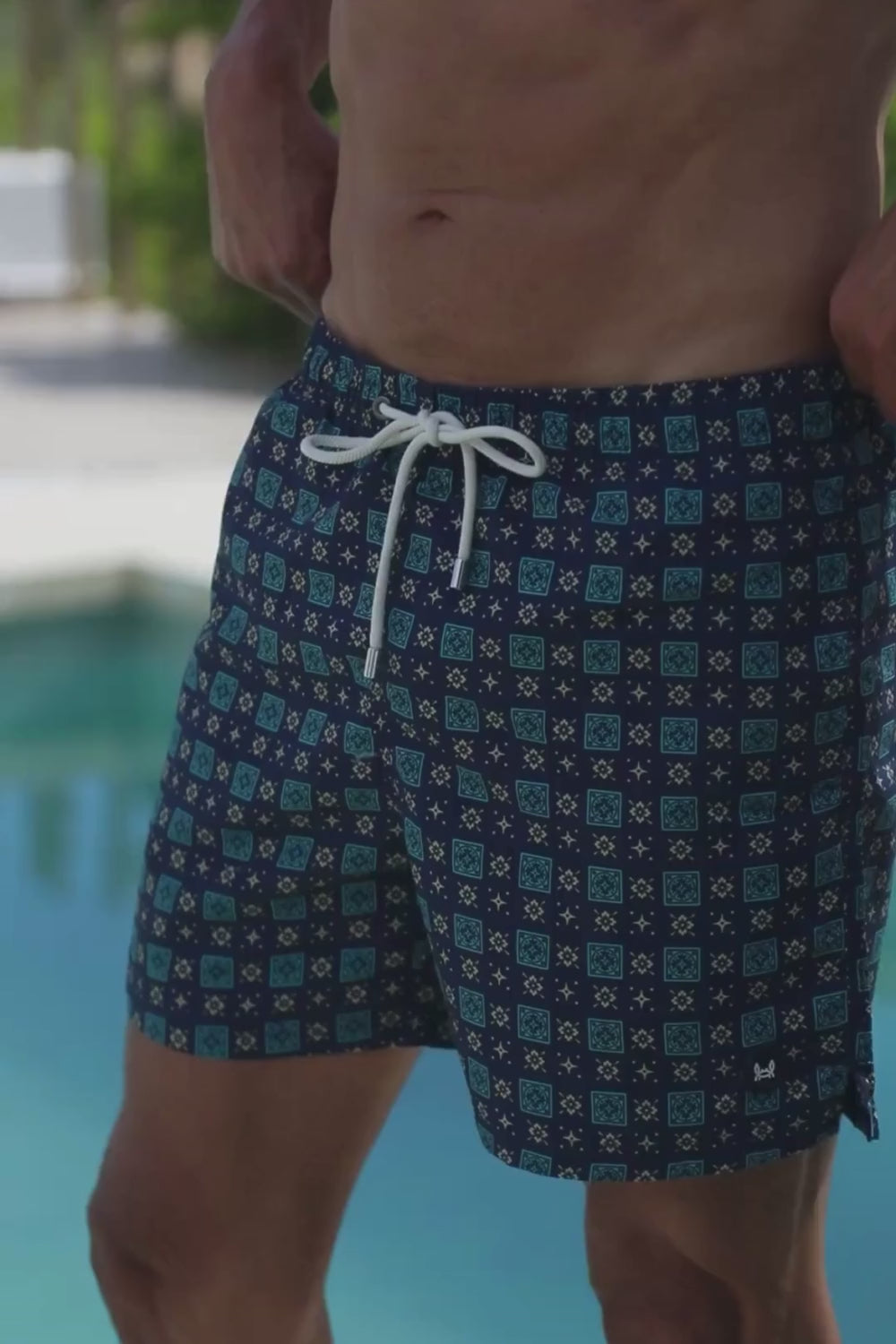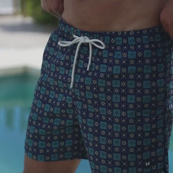 Bañador marino con estampado de flores. Confeccionado en 100% poliéster. Regular fit. Forro de malla. Cintura elástica con cordón de ajuste .Bolsillos laterales y bolsillo trasero con tapeta.