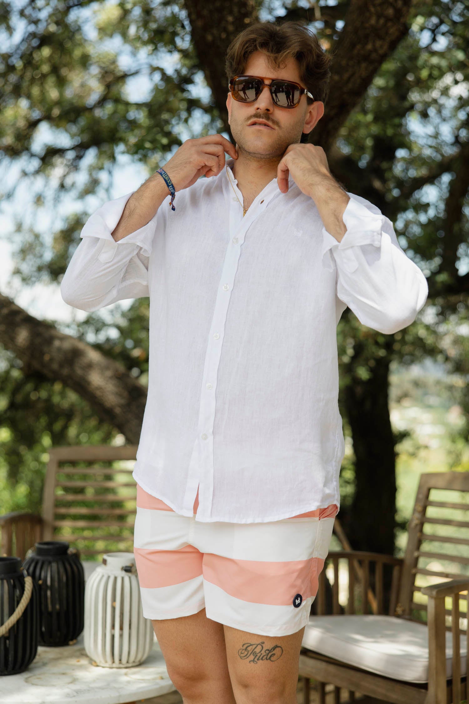 Bañador con estampado de rayas anchas en coral y crema. Confeccionado en 100% poliéster. Regular fit. Forro de malla. Cintura elástica con cordón de ajuste .Bolsillos laterales y bolsillo trasero con tapeta.