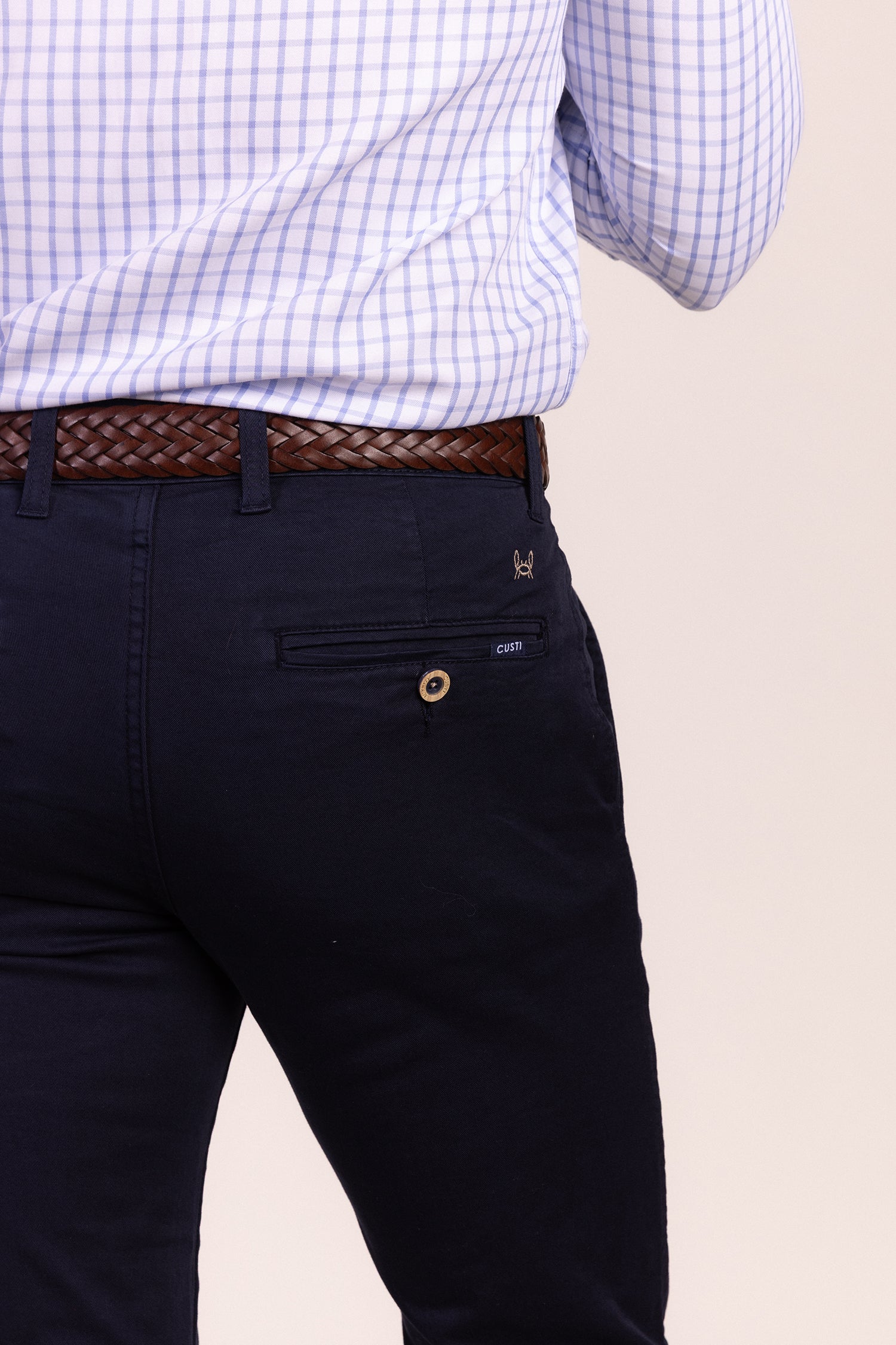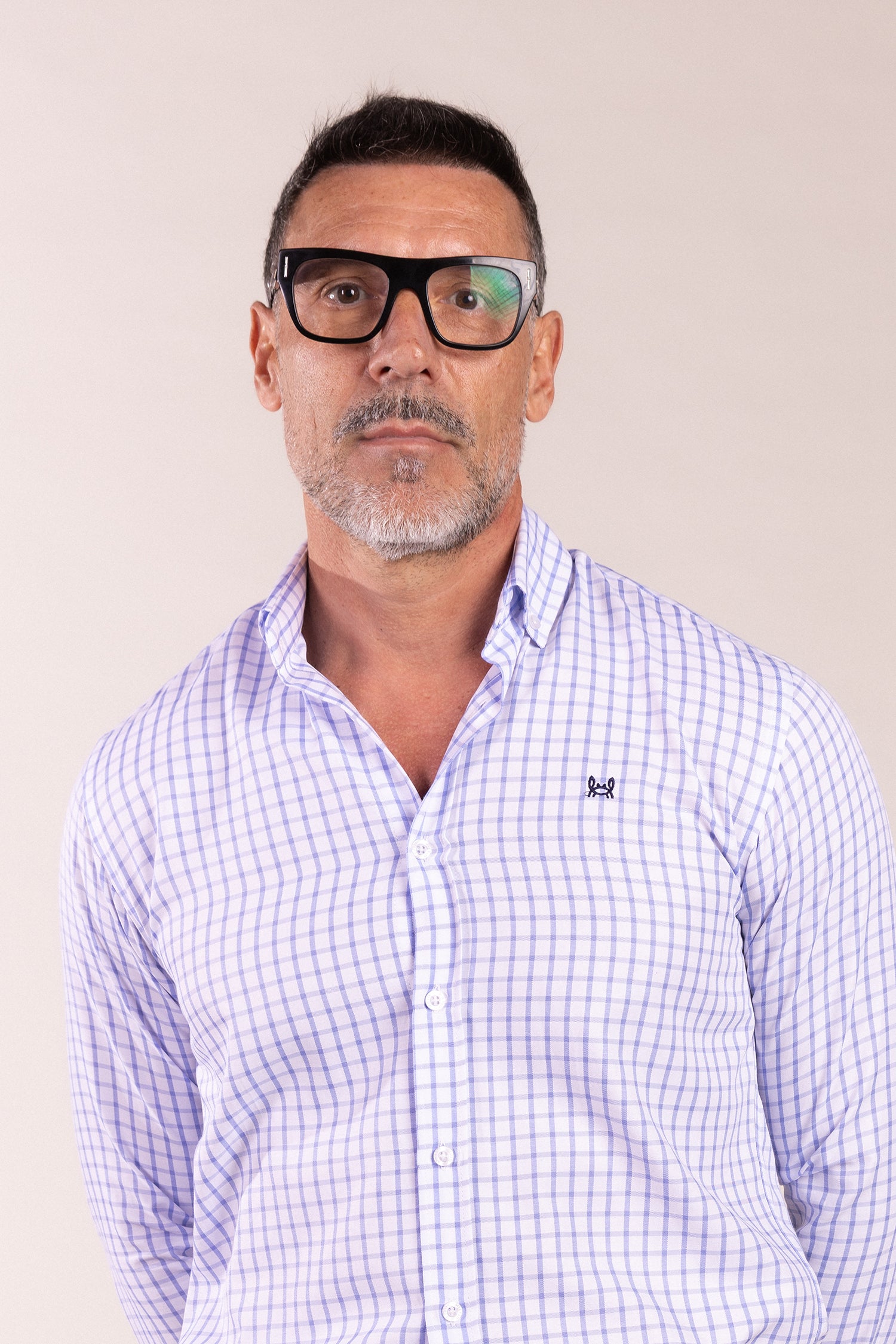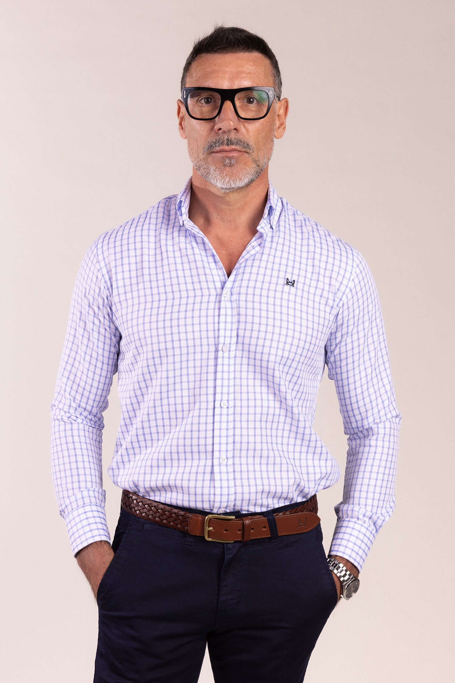 Camisa de cuadros color celeste, confeccionada en 100% algodón. Logo cangrejo a contraste en el pecho. Hecha en España.