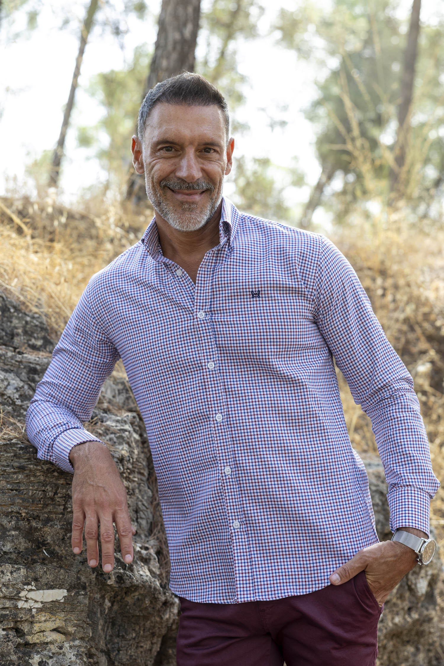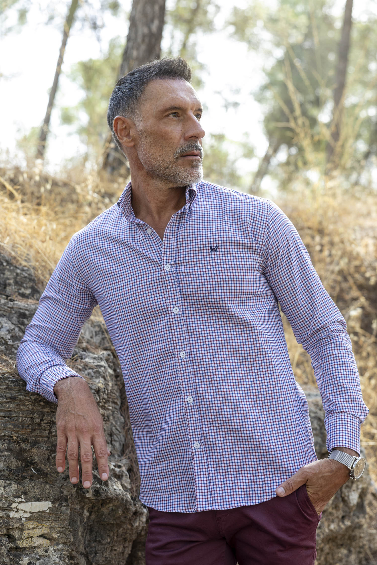 Camisa de villela a cuadros color granate y azul marino, confeccionada en 100% algodón. Logo cangrejo a contraste en el pecho. Hecha en España.