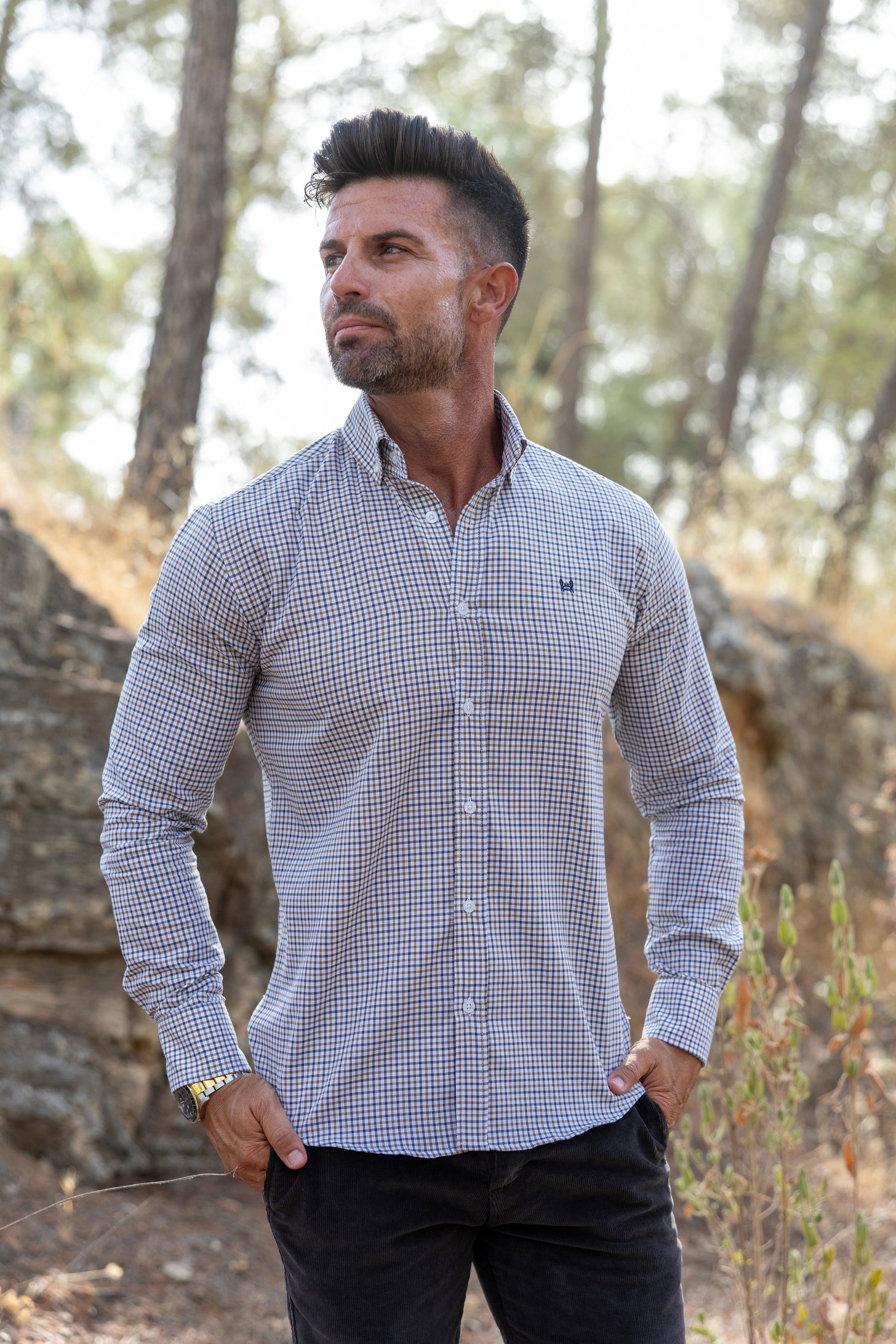 Camisa de villela a cuadros color verde y albero, confeccionada en 100% algodón. Logo cangrejo a contraste en el pecho. Hecha en España.