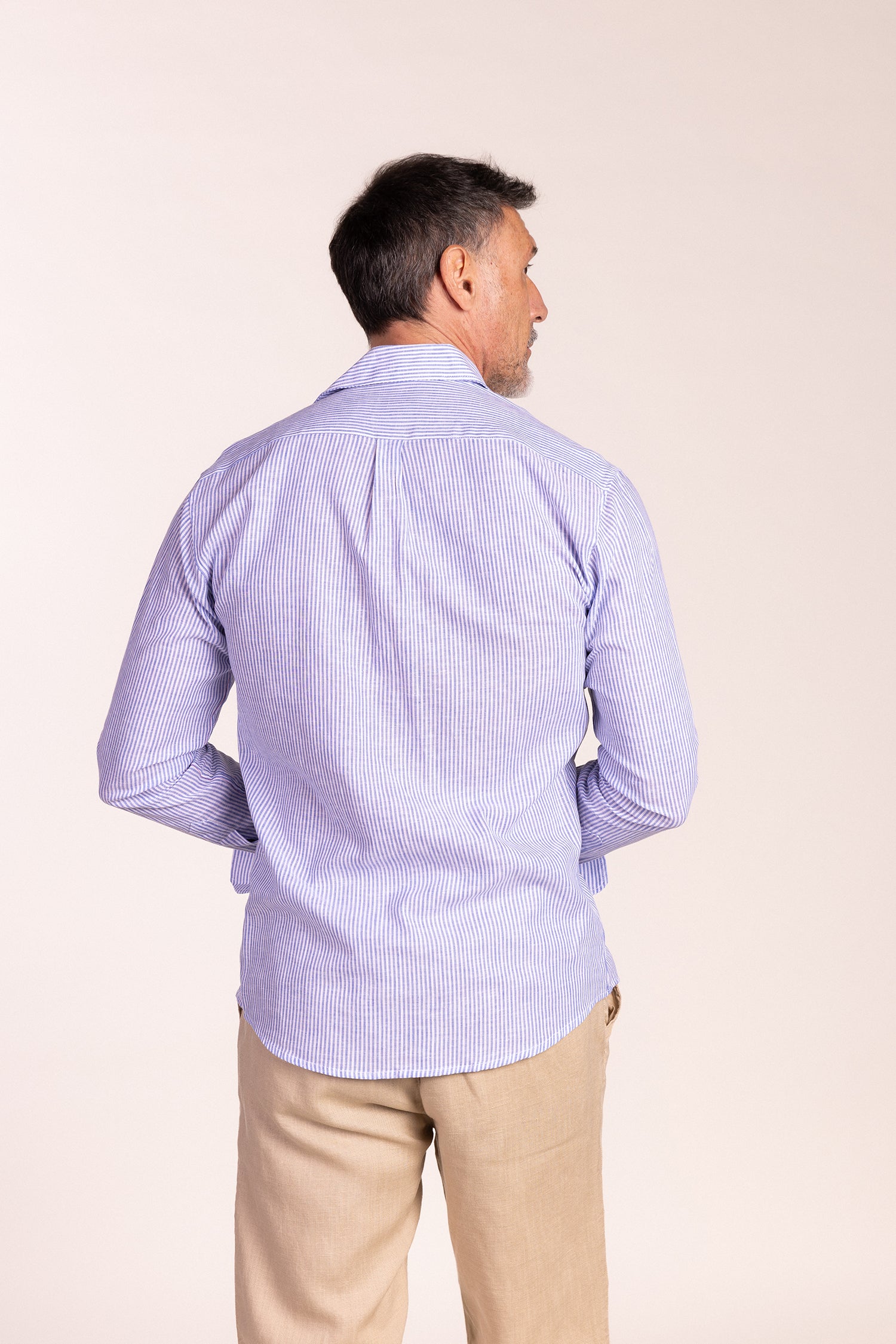 Camisa estilo a rayas color azul marino, confeccionada en 50% lino y 50% algodón. Corte Regular Fit. Cuello italiano. Manga larga terminada en puño simple. Logo cangrejo a contraste en el pecho. Hecha en España.