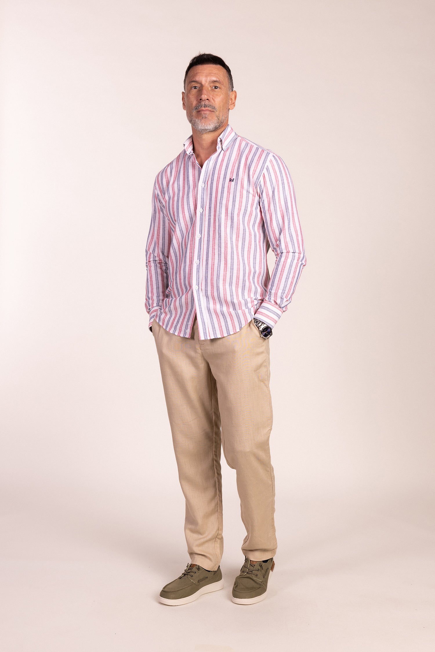 Camisa estilo multirayas en tono rojo y marino, confeccionada en 50% lino y 50% algodón. Corte Regular Fit. Cuello clásico con botones. Manga larga terminada en puño simple. Logo cangrejo a contraste en el pecho. Hecha en España.