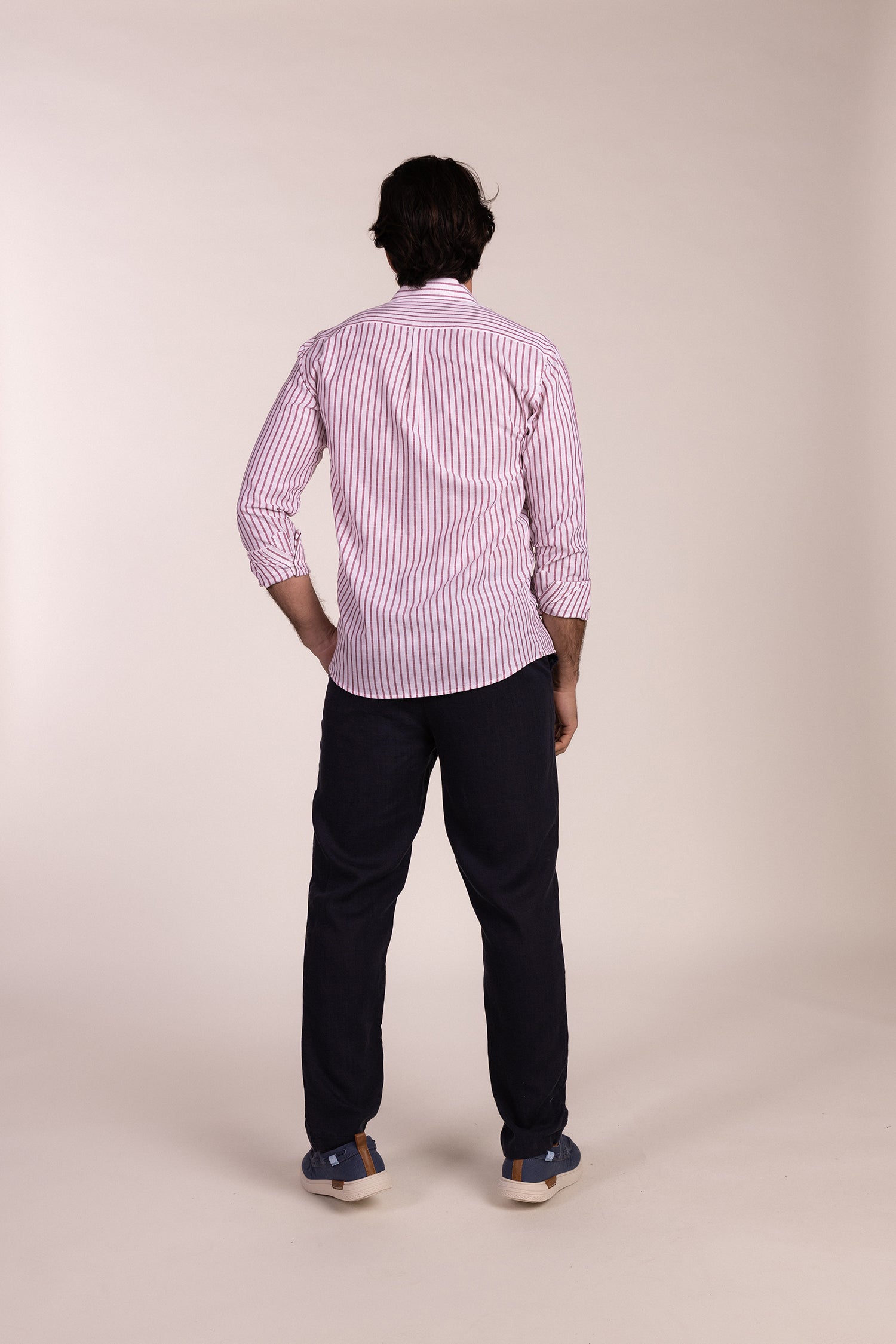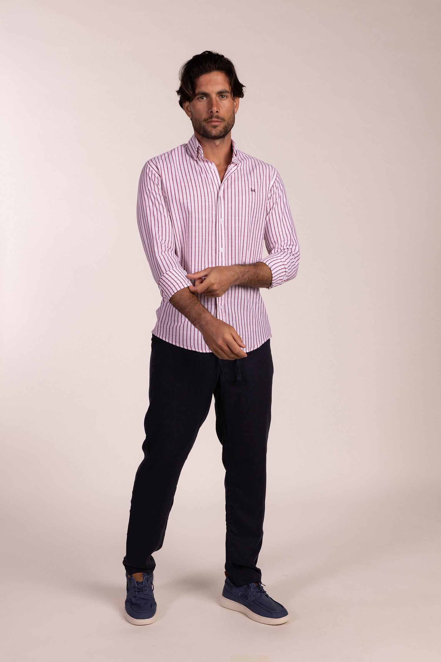 Camisa estilo rayas granate, confeccionada en 50% lino y 50% algodón. Corte Regular Fit. Cuello clásico con botones. Manga larga terminada en puño simple. Logo cangrejo a contraste en el pecho. Hecha en España.