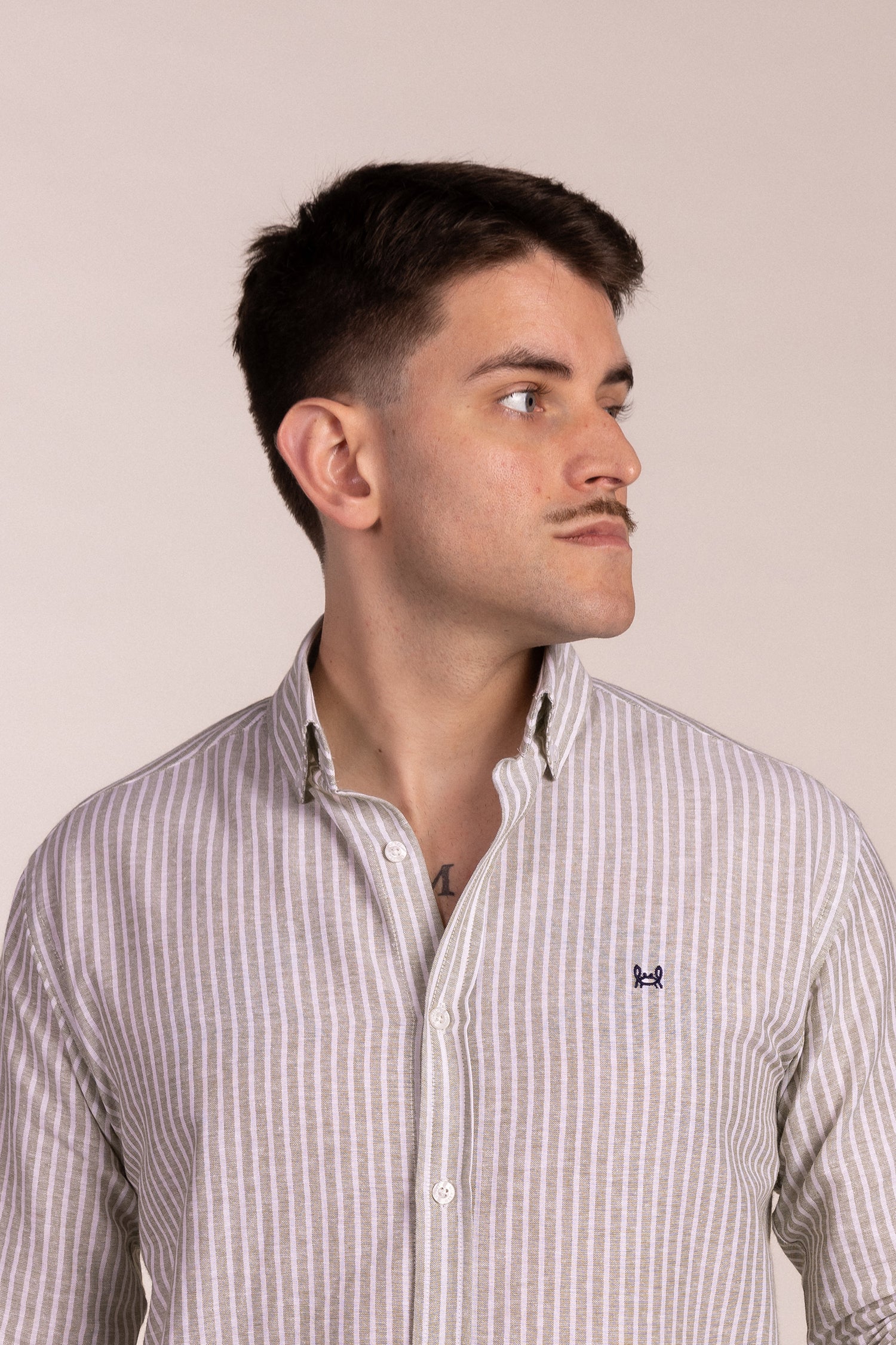 Camisa estilo rayas verde kaki, confeccionada en 50% lino y 50% algodón. Corte Regular Fit. Cuello clásico con botones. Manga larga terminada en puño simple. Logo cangrejo a contraste en el pecho. Hecha en España.