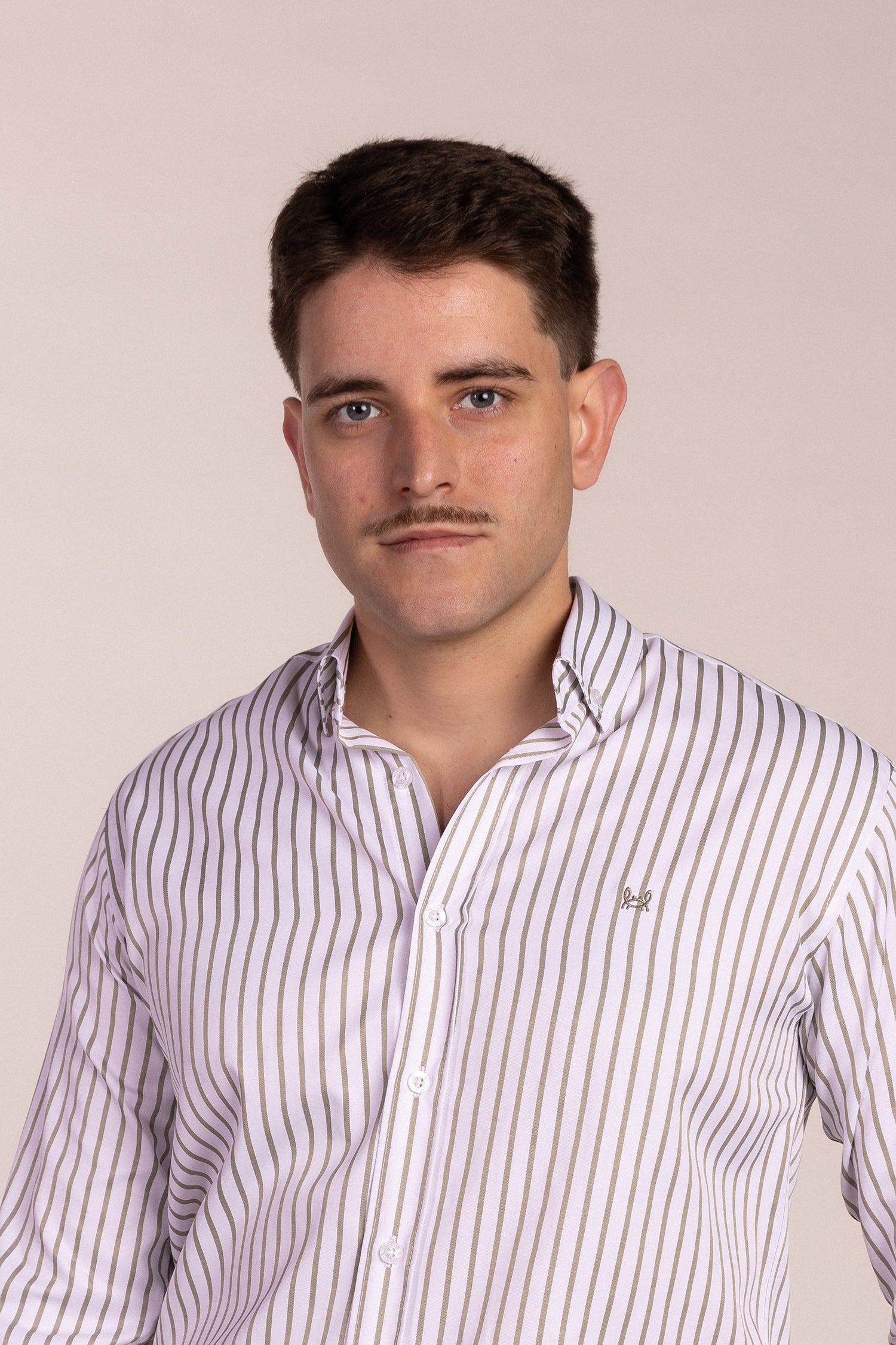 Camisa de popelín a rayas color verde kaki, confeccionada en mezcla de algodón y poliester. Logo cangrejo a contraste en el pecho. Camisa fabricada en España.