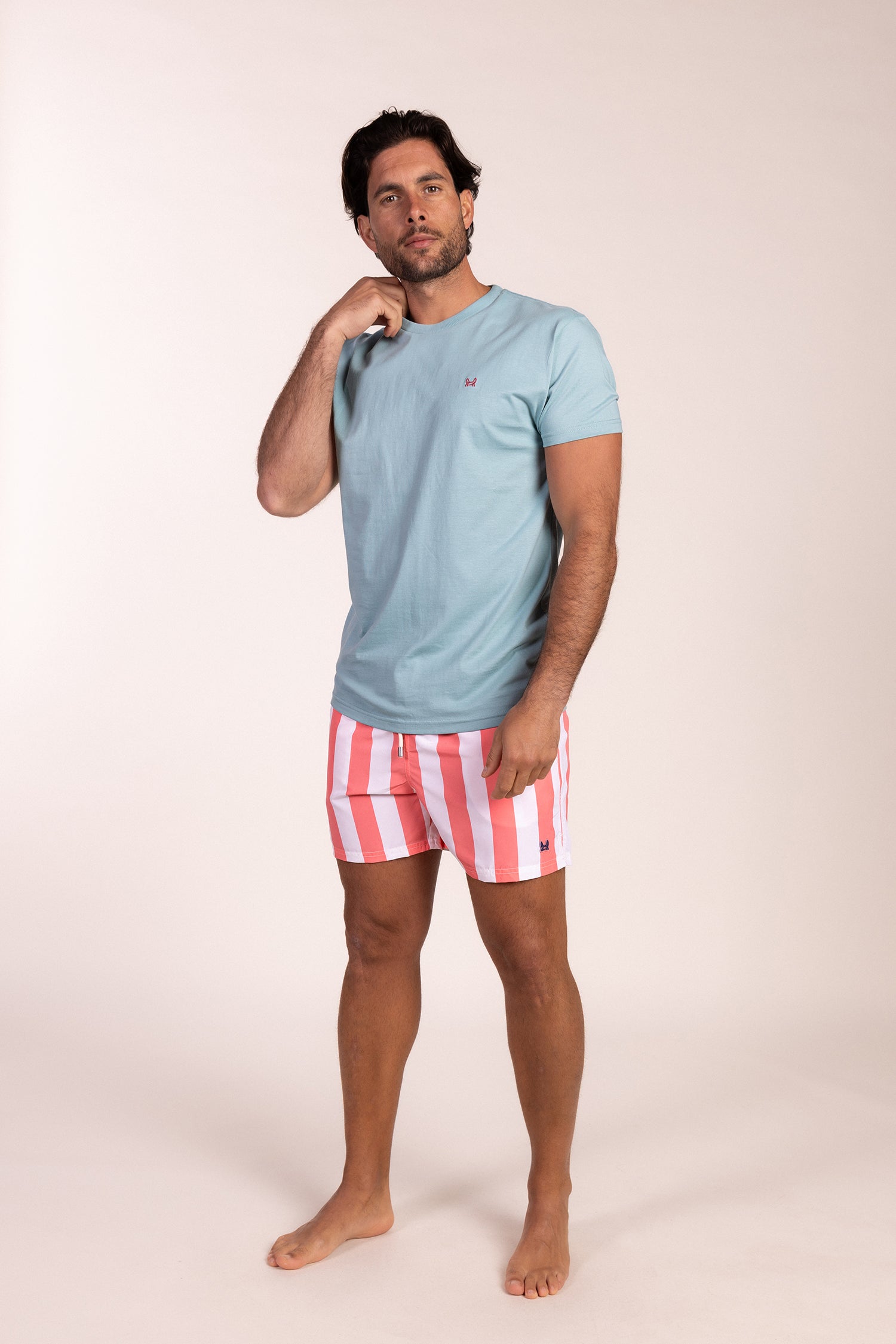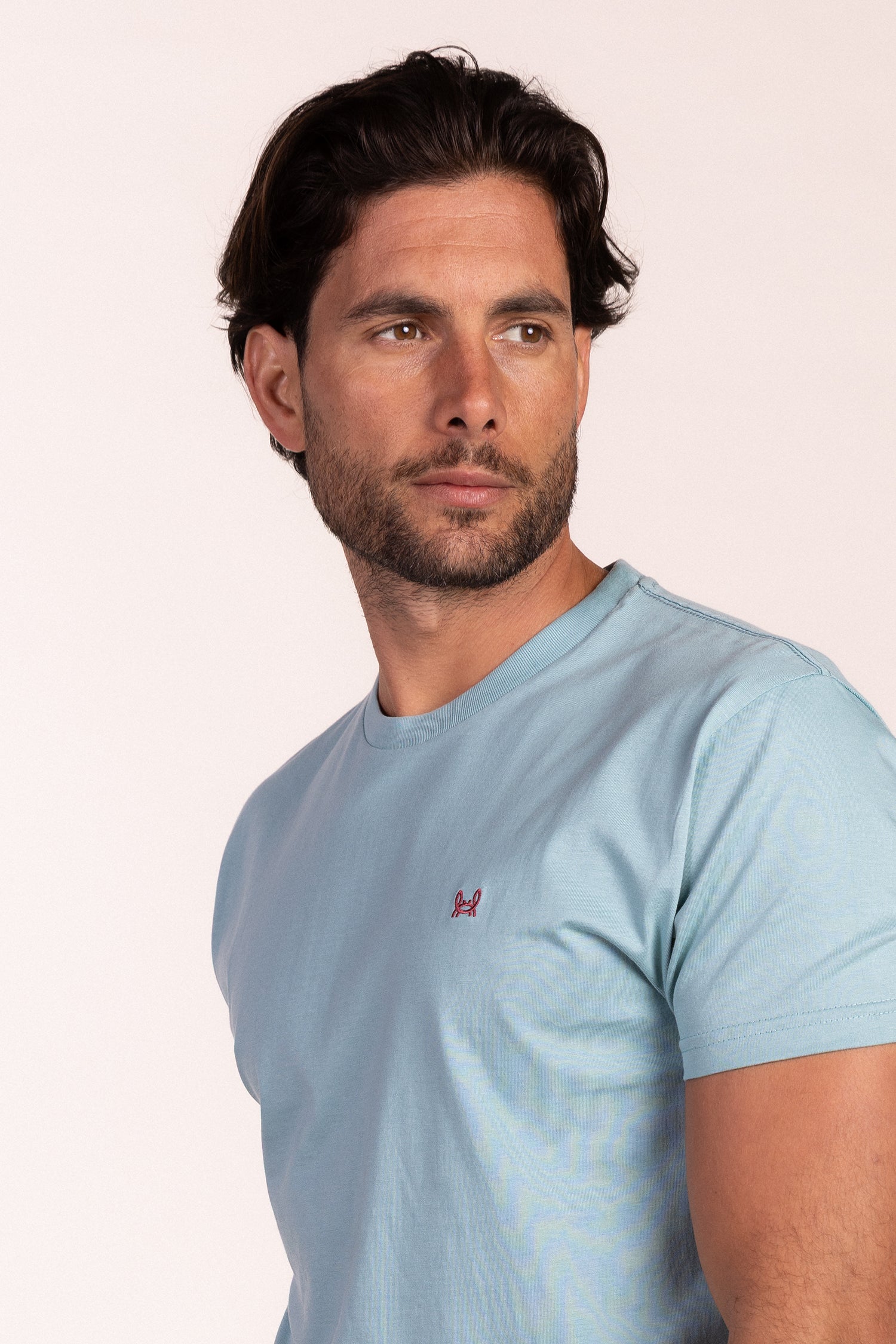 Camiseta básica del cangrejito en color azul agua confeccionada en 100% algodón. Presenta cuello redondo y terminaciones en cuello y boca manga acanaladas. Logo bordado del cangrejito a contraste en el pecho. Detalle en cuello al color del bordado.