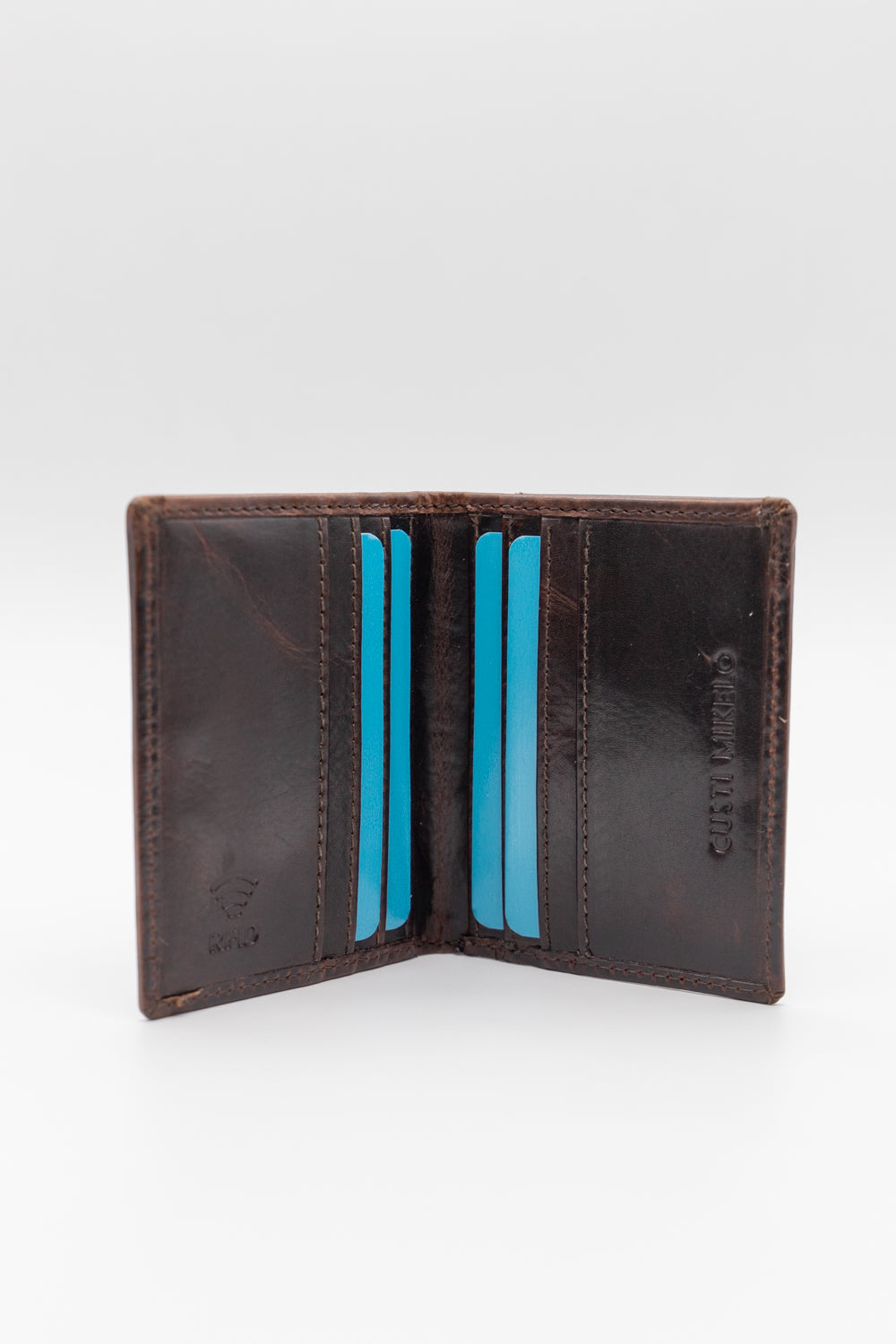 Cartera confeccionada en 100% piel vacuno engrasada. Tiene cierre de broche. Cuenta con departamentos para billetes, tarjetas y monedas. Grabado del logo en el exterior e interior.