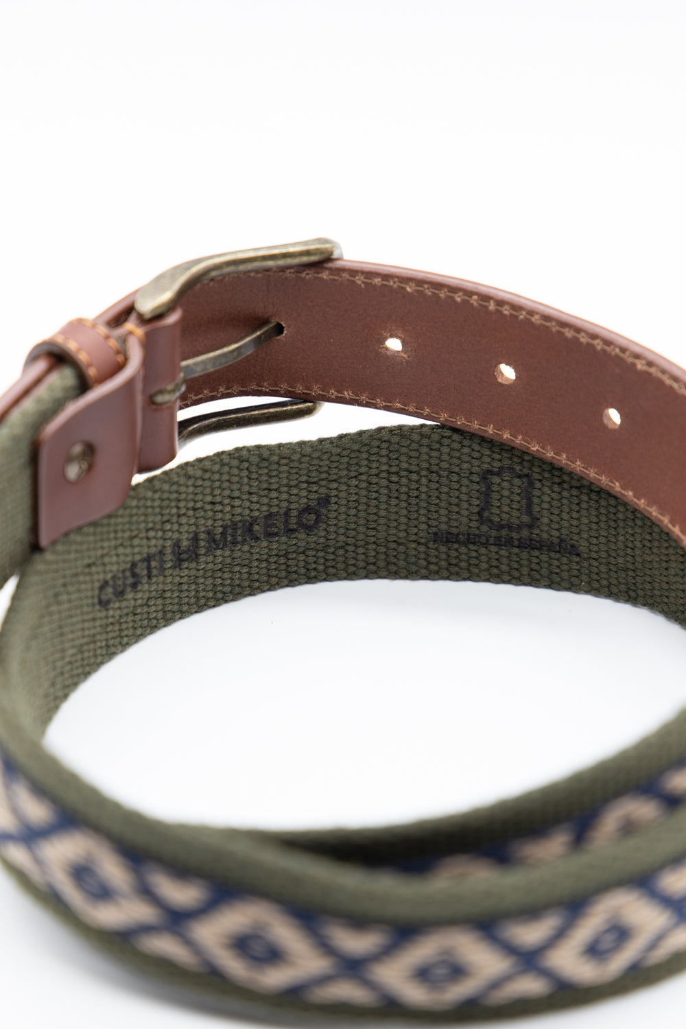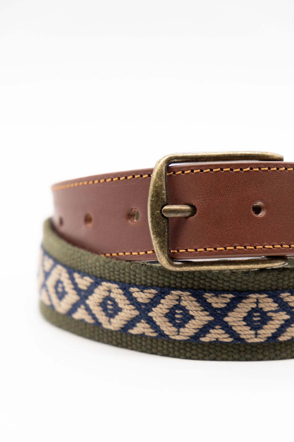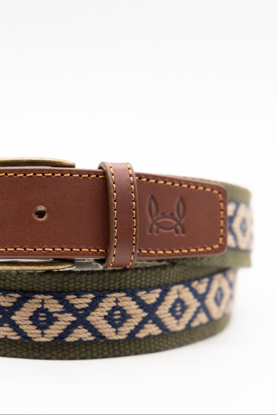Cinturón de lona étnico en tonos verde oliva y azul marino, con remates en piel 100% vacuno de primera calidad. Incorpora cierre con hebilla metálica envejecida, trabilla personalizada y nuestro emblemático cangrejo grabado en el extremo.