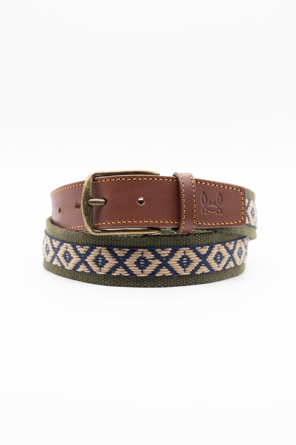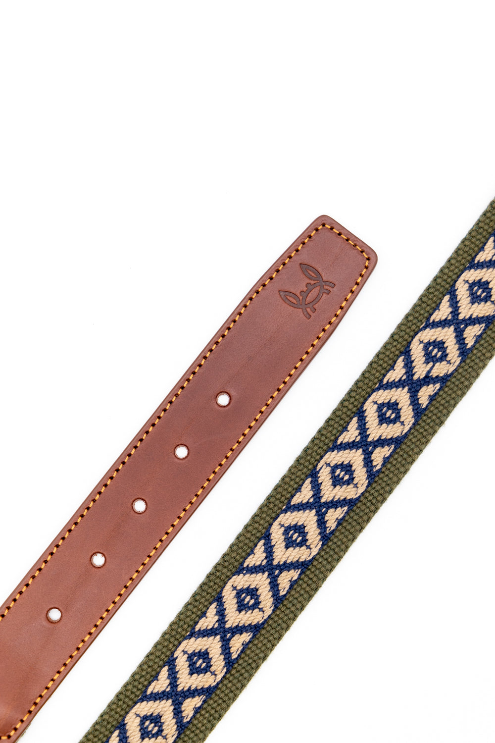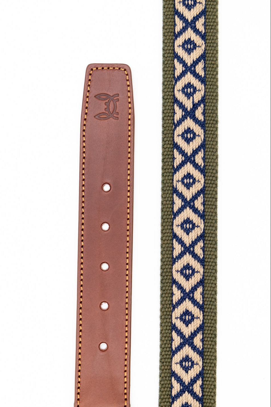 Cinturón de lona étnico en tonos verde oliva y azul marino, con remates en piel 100% vacuno de primera calidad. Incorpora cierre con hebilla metálica envejecida, trabilla personalizada y nuestro emblemático cangrejo grabado en el extremo.