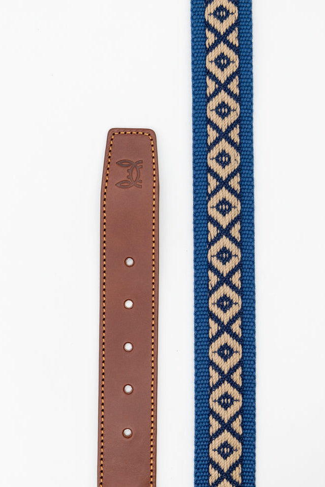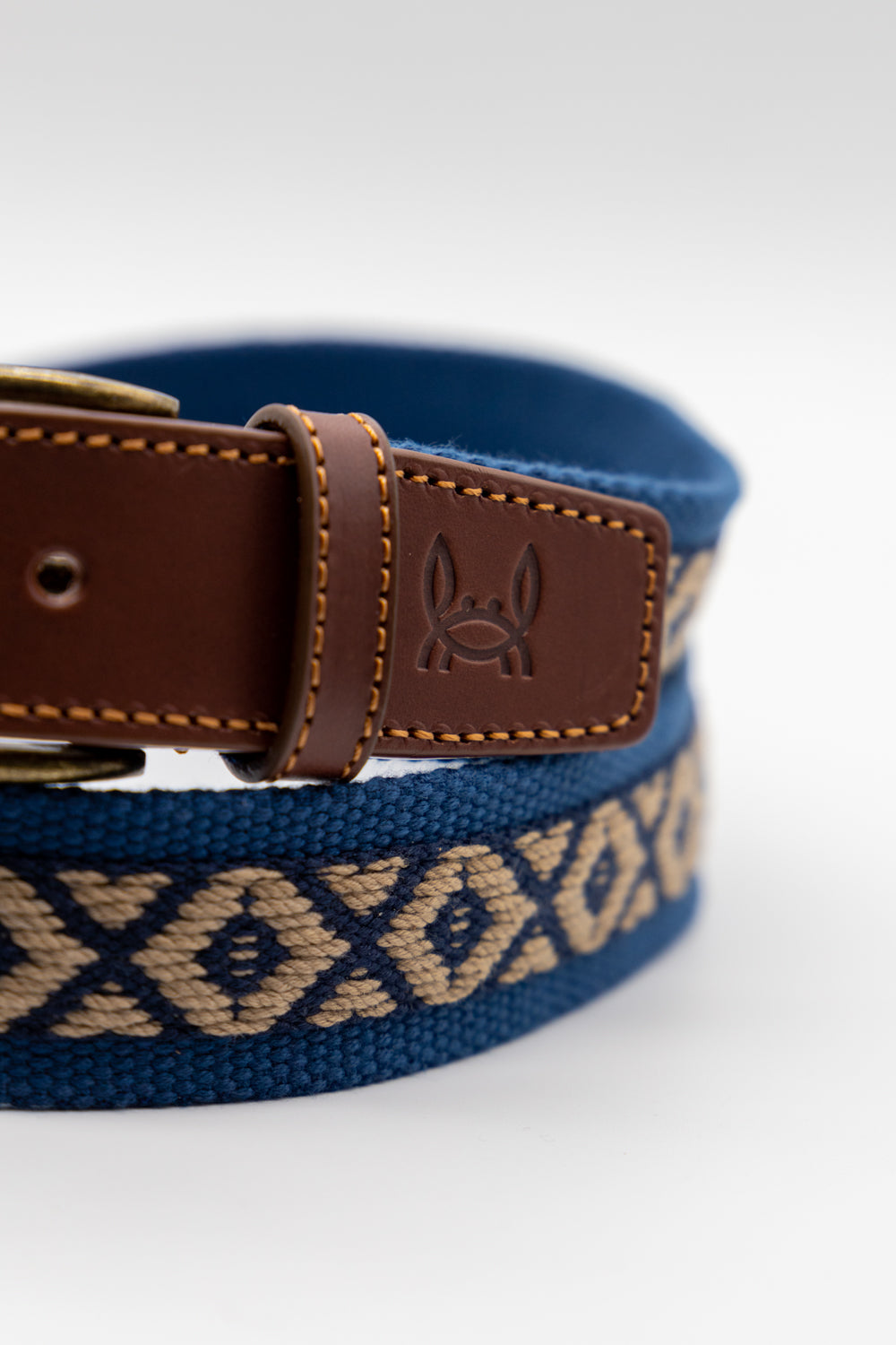 Cinturón de lona étnico en tonos azul con detalles en beige, rematado con piel 100% vacuno de primera calidad. Incorpora cierre con hebilla metálica envejecida, trabilla personalizada y nuestro icónico cangrejo grabado en el extremo.