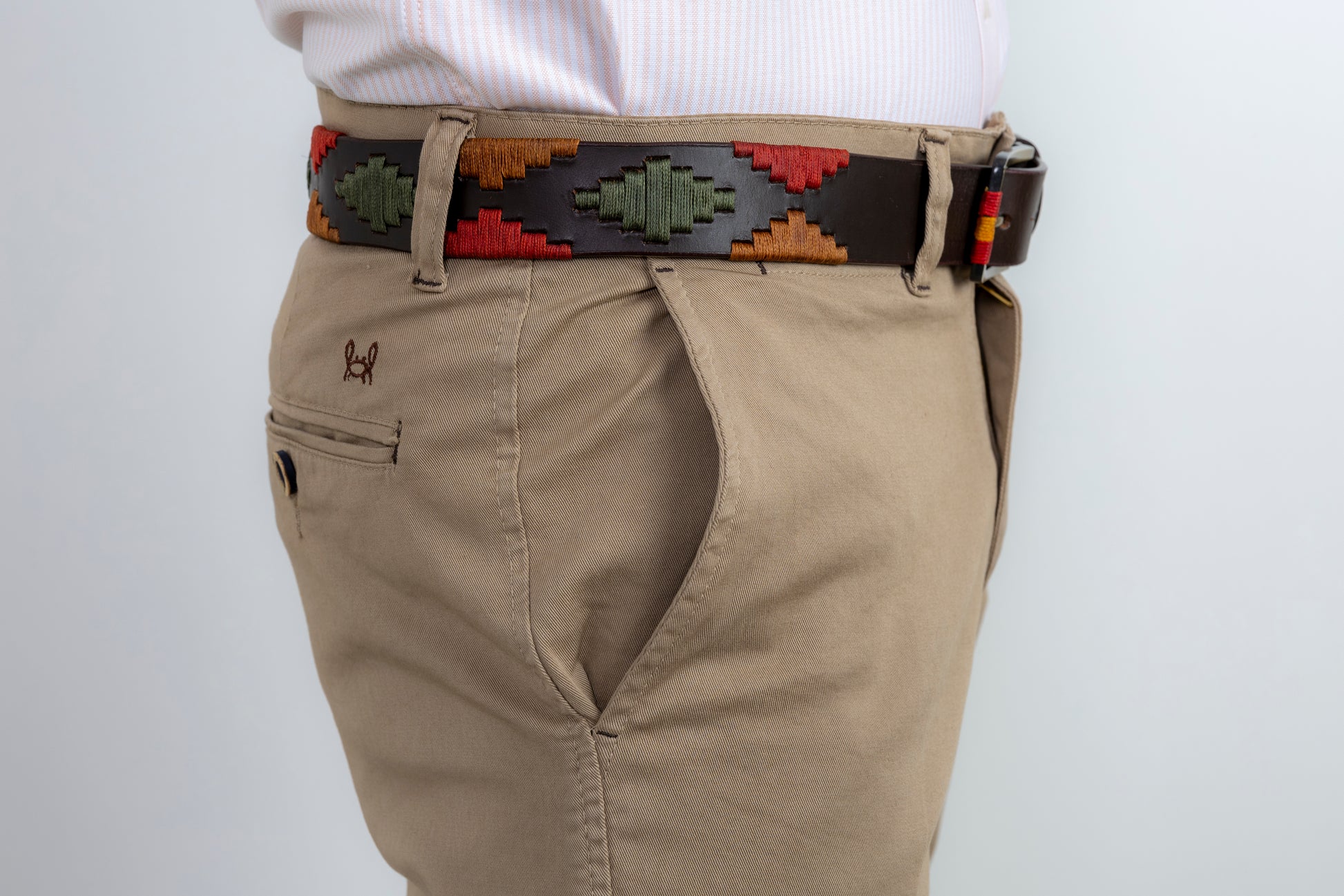 Cinturón argentino confeccionado en 100% piel. Presenta cierre con hebilla metálica. Cuenta con el logo grabado en el extremo y motivos étnicos de hilos encerados. Fabricado en España.