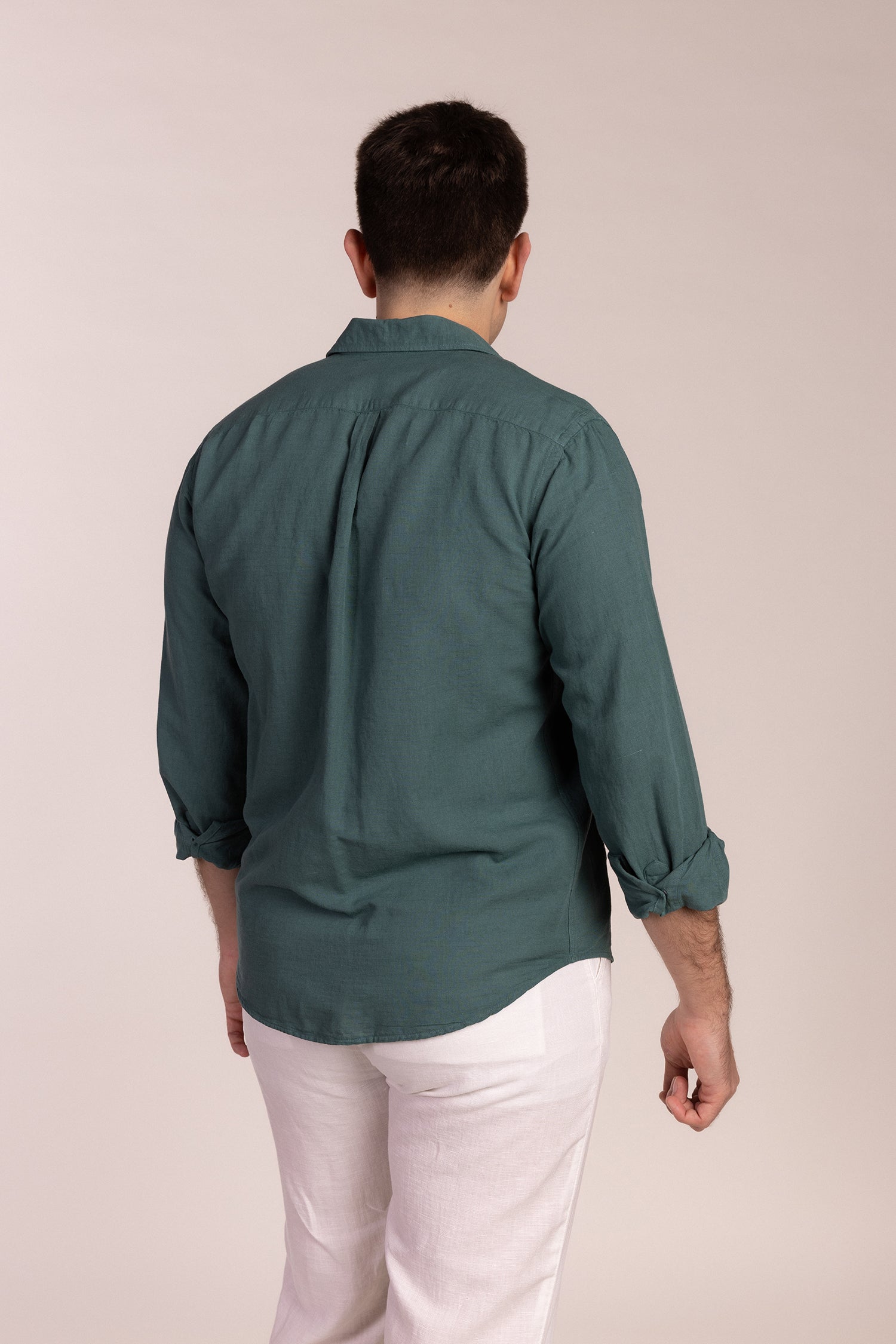 Guayabera verde con cuatro bolsillos en el frontal confeccionada en lino y algodón. Corte regular fit. Cuello de solapa, manga larga con terminación de botones y abertura en el bajo.