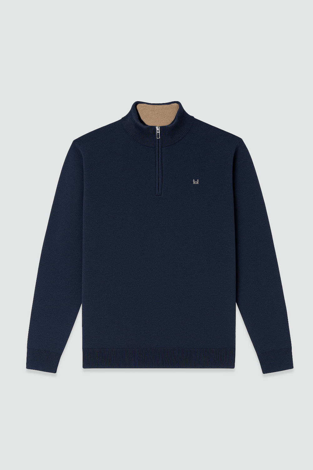 Jersey media cremallera de punto vigore, en color azul marino confeccionado en 100% algodón. Corte recto, cuello alto con interior a contraste, abertura con cierre de media cremallera. Bordado al contraste en el pecho.