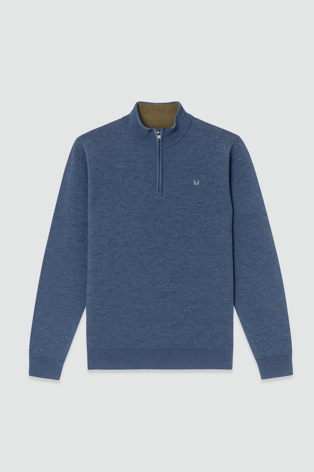 Jersey media cremallera de punto vigore, en color azulón confeccionado en 100% algodón. Corte recto, cuello alto con interior a contraste, abertura con cierre de media cremallera. Bordado al contraste en el pecho.