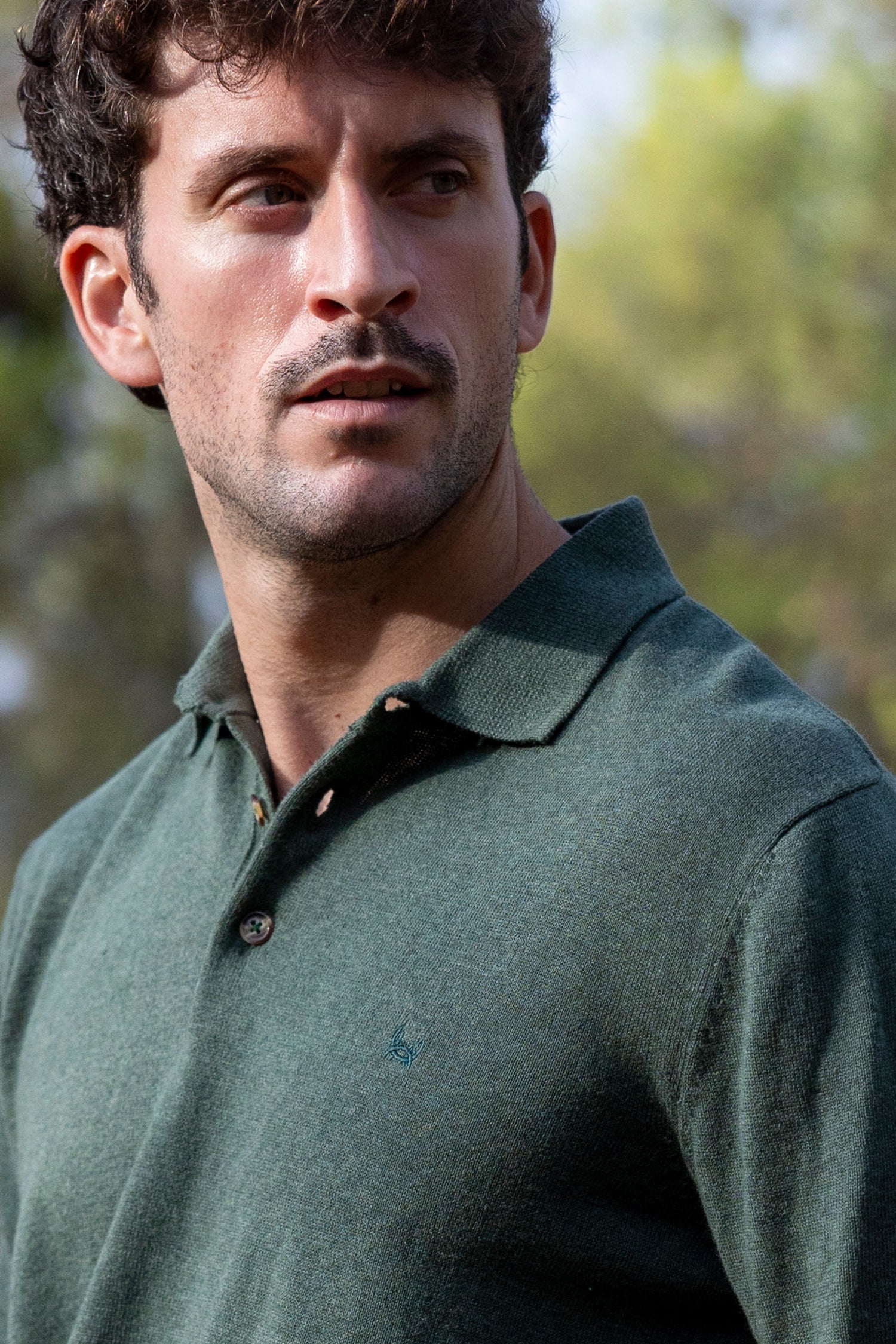 Jersey polo de punto 100% algodón en color césped, una prenda versátil que combina la comodidad del punto con la elegancia del estilo polo. Presenta cuello tipo polo con tapeta de botones, lo que aporta un aire clásico y atemporal. Su corte Regular fit y los acabados acanalados en puños y bajo garantizan un ajuste perfecto y mayor durabilidad. El color verde césped aporta frescura y vitalidad, convirtiéndolo en una opción ideal para looks casuales y elegantes. Incluye bordado de la marca en el pecho y un aplique metálico personalizado en la parte inferior, detalles que realzan su carácter único.