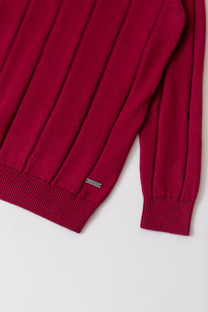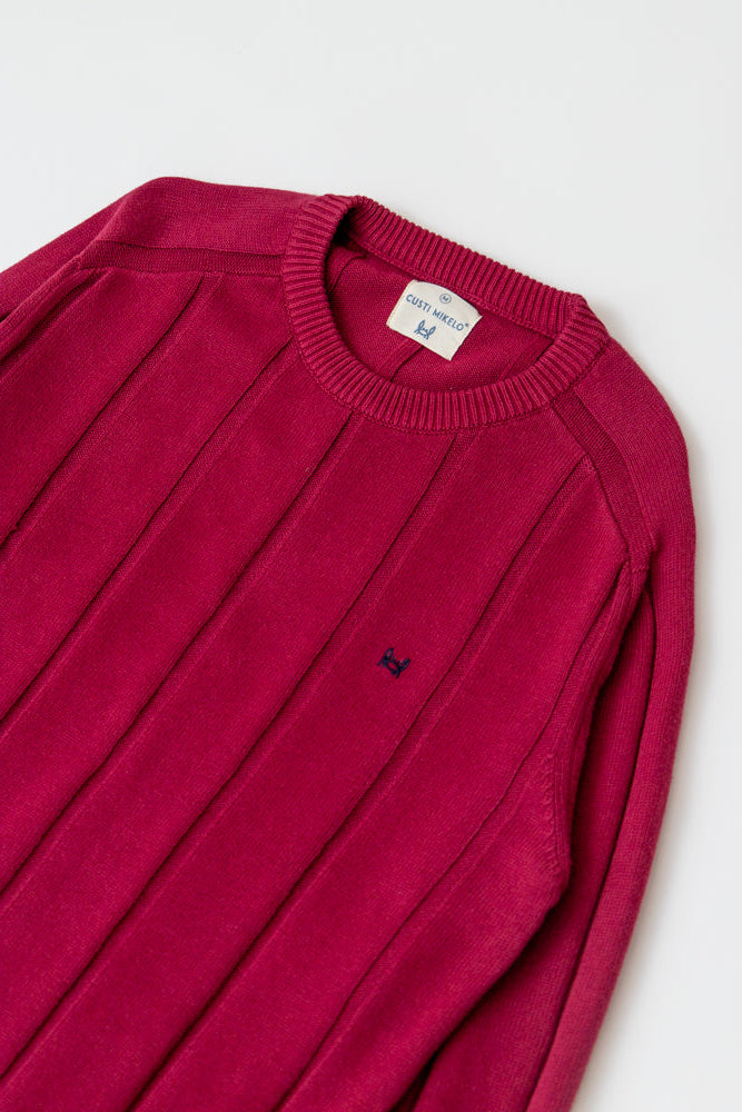 Jersey burdeos de punto 100% algodón, una prenda versátil y cómoda que combina estilo y funcionalidad. Su diseño estructurado con textura de líneas verticales aporta un aire elegante y actual. Presenta cuello redondo clásico y corte Regular fit, con acabados acanalados en puños, cuello y bajo que aseguran un ajuste perfecto y mayor resistencia. Como detalles distintivos, incorpora el bordado de la marca en el pecho y un aplique metálico personalizado en la parte inferior, que realzan su carácter único. Un básico imprescindible para looks casuales y urbanos.