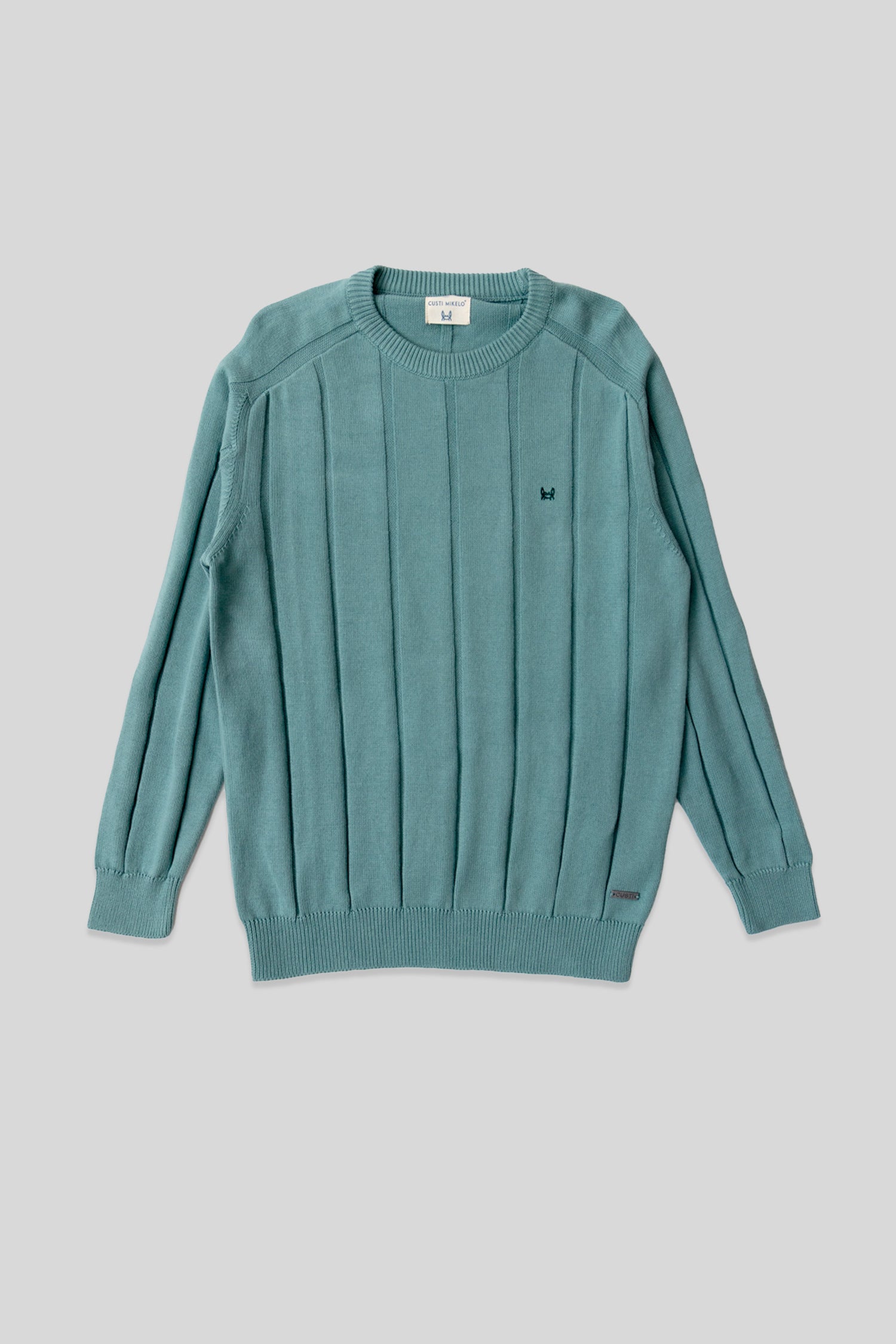 Jersey verde de punto 100% algodón, una prenda versátil y cómoda que combina estilo y funcionalidad. Su diseño estructurado con textura de líneas verticales aporta un aire elegante y actual. Presenta cuello redondo clásico y corte Regular fit, con acabados acanalados en puños, cuello y bajo que aseguran un ajuste perfecto y mayor resistencia. Como detalles distintivos, incorpora el bordado de la marca en el pecho y un aplique metálico personalizado en la parte inferior, que realzan su carácter único. Un básico imprescindible para looks casuales y urbanos.