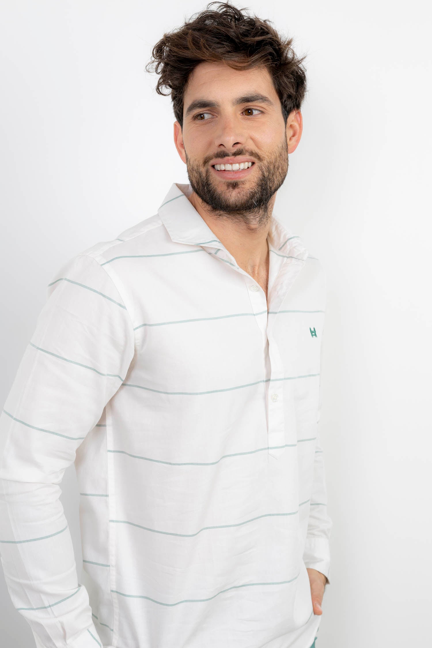 Camisa estilo polera blanca con rayas color verde, cierre central medio de cuatro botones confeccionada en 100% algodón. Corte Regular Fit. Cuello italiano. Manga larga terminada en puño simple. Logo cangrejo a contraste en el pecho.