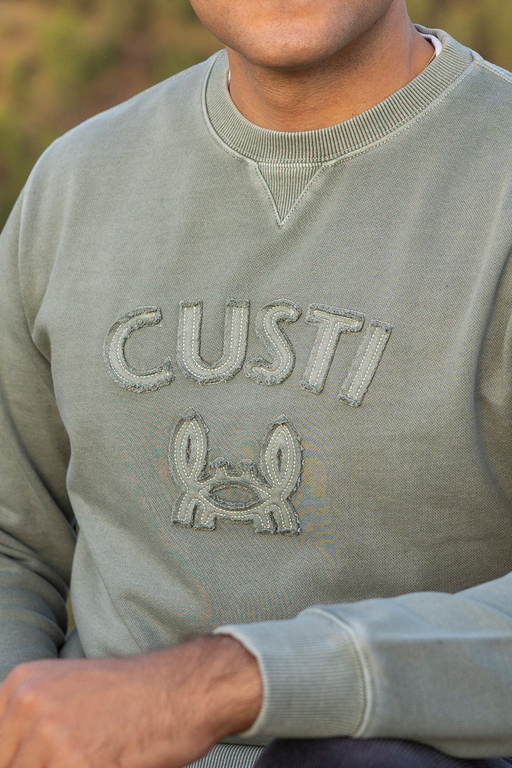 Sudadera en color verde con efecto lavado garment dyed, confeccionada en algodón de alta calidad que ofrece suavidad, resistencia y un estilo único. Su diseño destaca por el bordado en relieve del logotipo CUSTI junto al icónico cangrejo en la parte frontal, aportando personalidad y carácter a la prenda.